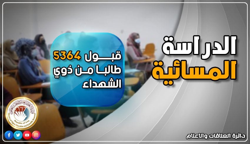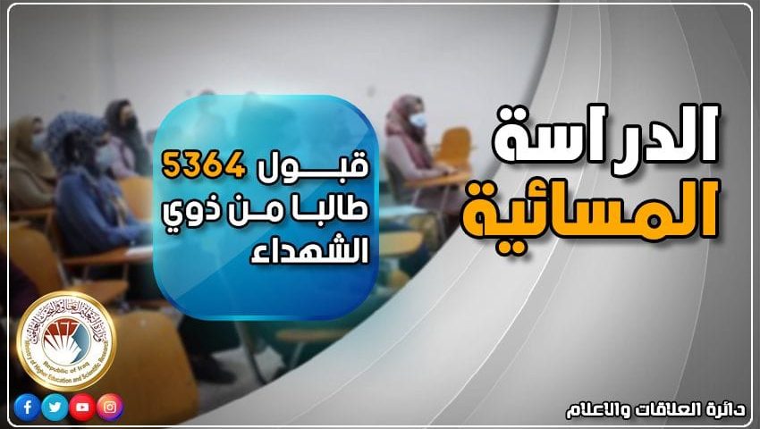 تعلن وزارة التعليم العالي والبحث العلمي نتائج قبول الطلبة من ذوي الشهداء في الدراسة المسائية للسنة الدراسية 2020/2021.