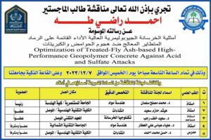 تجري باذن الله تعالى مناقشة طالب الماجستير (احمد راضي طه) عن رسالته الموسومة امثلية الخرسانة الجيوبو ليمرية العالية الاداء القائمة على الرماد المتطاير المعالج ضد هجوم الحوامض والكبريتات وذلك في تمام الساعة التاسعة صباحا يوم الخميس الموافق 2023/12/7 وعلى القاعة الذكية بجامعتنا