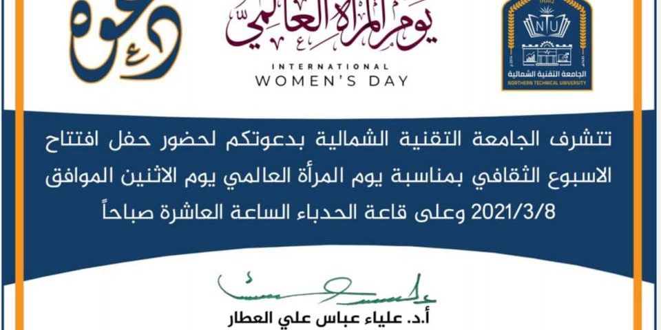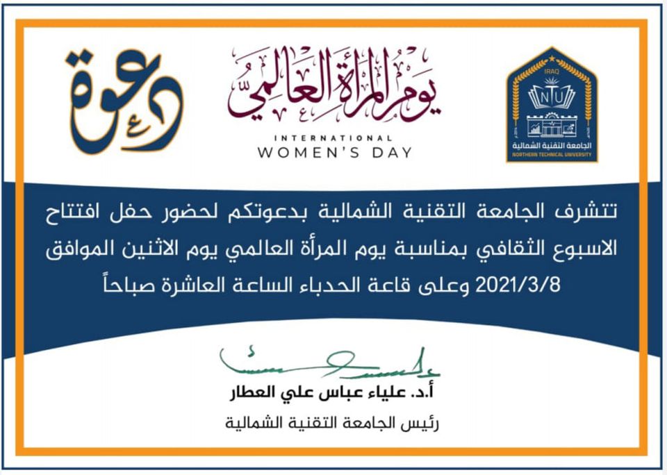افتتاحية الاسبوع الثقافي لتمكين المراة بمناسبة يوم المرأة العالمي والدعوة عامة للجميع في كليات الجامعة ومعاهدها موقع محافظة نينوى …مع مراعاة الشروط الصحية.
