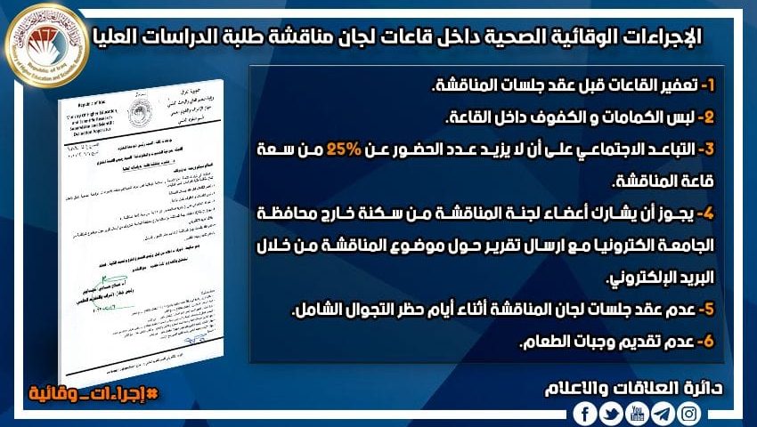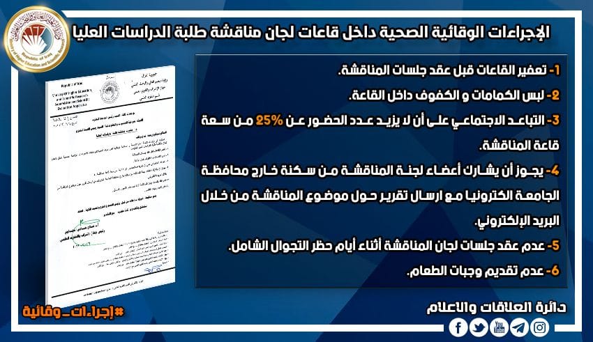التعليم توجه بالتزام إجراءات الوقاية في مناقشات الدراسات العليا وتؤكد إمكانية المشاركة الإلكترونية لأعضاء اللجان من خارج محافظة الجامعة