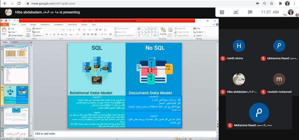 تناولت الورشة:- بيان التطور الحاصل في قواعد البيانات وعرض اهم انواع انظمة ادارة قواعد البيانات وهي SQL وNO SQL.