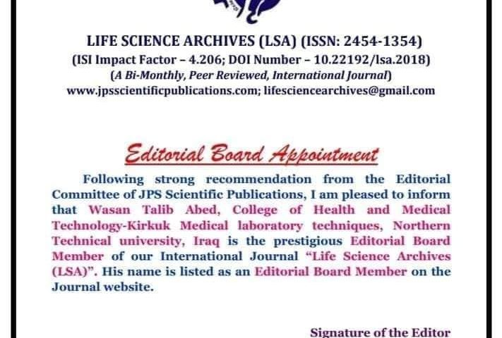 ضمن الإبداع المتواصل للجامعة التقنية الشمالية عموماً والكلية التقنية الصحية والطبية في كركوك خصوصاً، إنضمت الآنسة المدرس “وسن طالب عبد” التدريسية في الكلية التقنية الصحية والطبية/كركوك قسم تقنيات المختبرات الطبية إلى إسرة تحرير مجلة عالمية ضمن مستوعبات سكوبس حيث إختارت مجلة international journal of life science archive