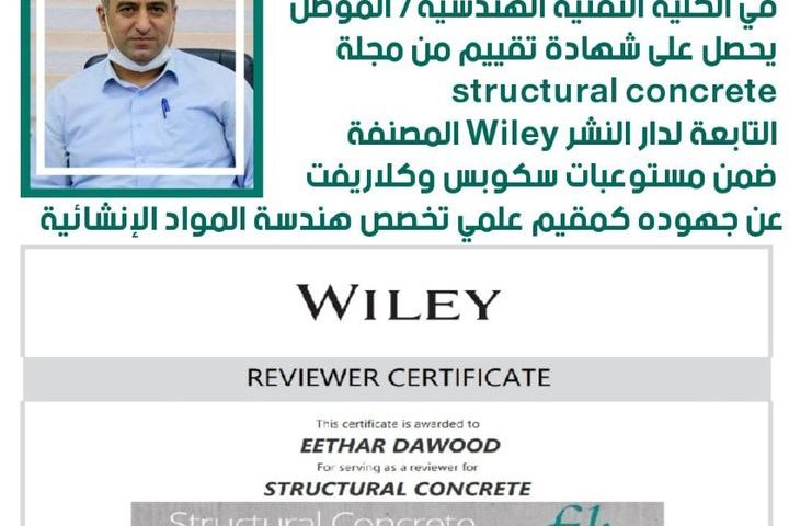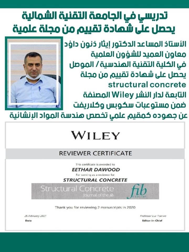 تدريسي في الجامعة التقنية الشمالية يحصل على شهادة تقييم من مجلة علمية