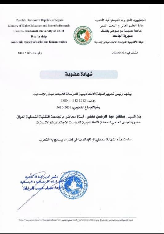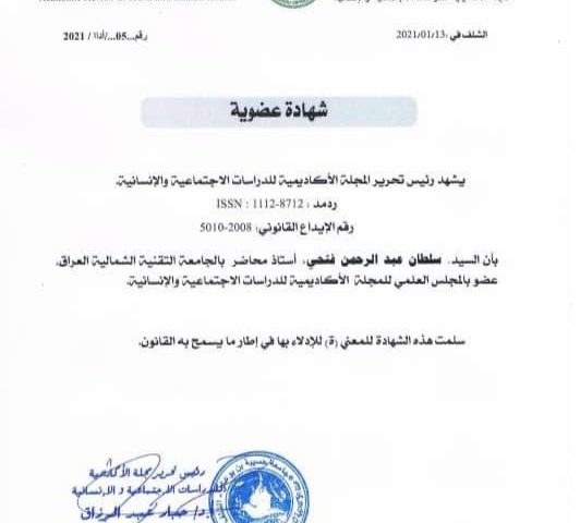 أُختير الاستاذ المساعدالدكتور سلطان عبد الرحمن فتحي التدريسي في قسم تقنيات الإدارة الإلكترونية في الكلية التقنية الادارية الموصل (عضواً بالمجلس العلمي للمجلة الاكاديمية للدراسات الاجتماعية والانسانية). في جامعة حسيبة بن بوعلي بالشلف /الجزائر.