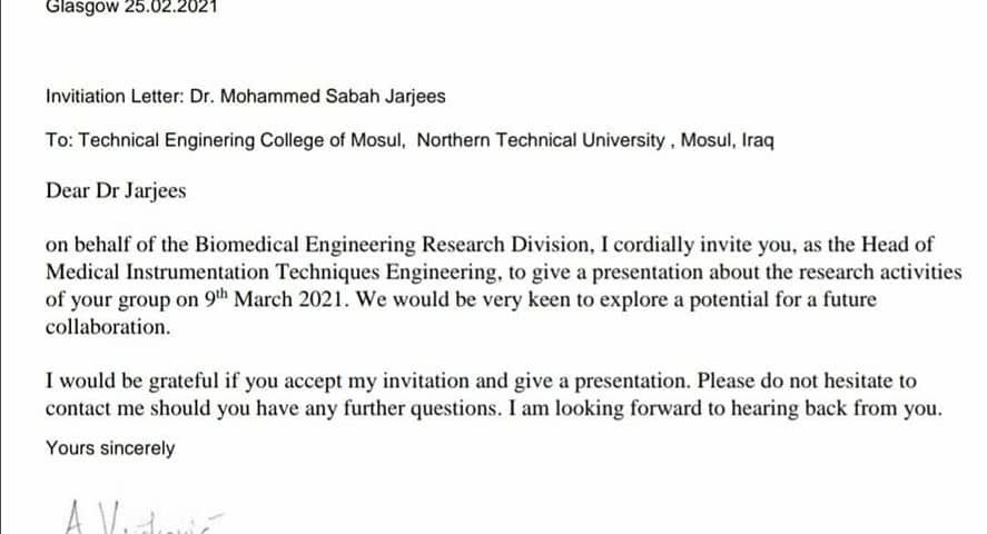 يتواصل أكاديمي الجامعة التقنية الشمالية علمياً مع الجامعات والمؤسسات العلمية في مجال حركة البحث العلمي فقد وجهت دعوة من قبل جامعة كلاسكو البريطانية الى الاستاذ المساعد الدكتور محمد صباح جرجيس رئيس قسم هندسة تقنيات الأجهزة الطبية في الكلية التقنية الهندسية الموصل ، وذلك لألقاء محاضرة علمية في التاسع من شهر أذار القادم عن آخر البحوث العلمية في مجال هندسة تقنيات الأجهزة الطبية المنشورة مع فريقه البحثي في عدة مجلات علمية رصينة.