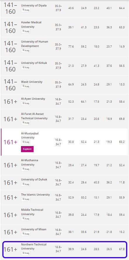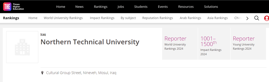 احتلت الجامعة التقنية الشمالية في تصنيف التايمز الخاص بالمنطقة العربية التسسلسل (+161) من بين الجامعات العربية والتسلسل (29) بين الجامعات العراقية كما موضح في الصورة والرابط ادناه.
