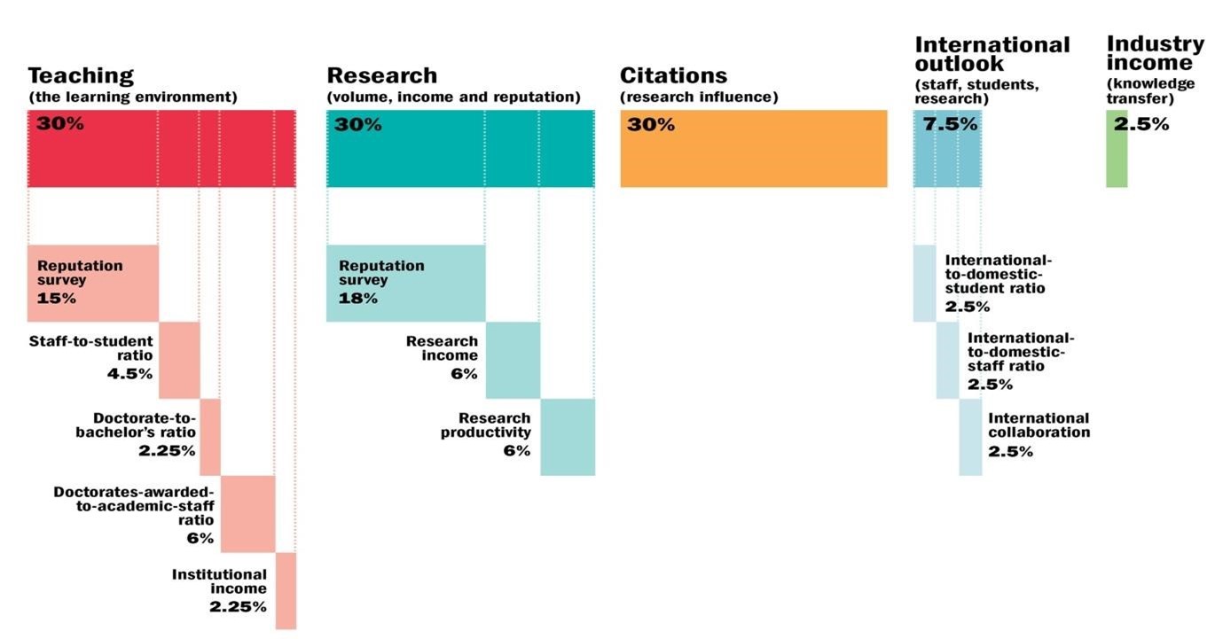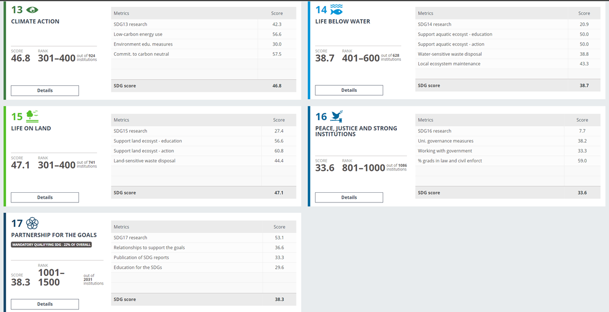 يعتبر تصنيف التايمز البريطاني من التصنيفات المهمة في تقييم الجامعات وفقاً لاهداف التنمية المستدامة (SDGs) Sustainable Development Goals حيث يتم استخدام مؤشرات خاصة لتوفير مقارنة شاملة ومتوازنة تخص 17 هدف من أهداف التنمية المستدامة وهي كما موضح أدناه: