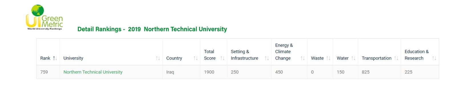 فظهرت الجامعة التقنية الشمالية في هذا التصنيف لاول مرة في عام 2019 بإحرازها المرتبة 759 عالمياً و 38 محلياً وكما موضح في الصورة ادناه: