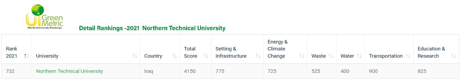 وأنطلاقا من سعي الجامعة التقنية الشمالية المستمر لتطوير كافة المرافق الاكاديمية والخدمية في الجامعة ، شرعت بإطلاق مبادرة الجامعة الخضراء عام 2020 حيث حصلت الجامعة في عام 2021 على المرتبة 732 عالمياً و25 محلياً.