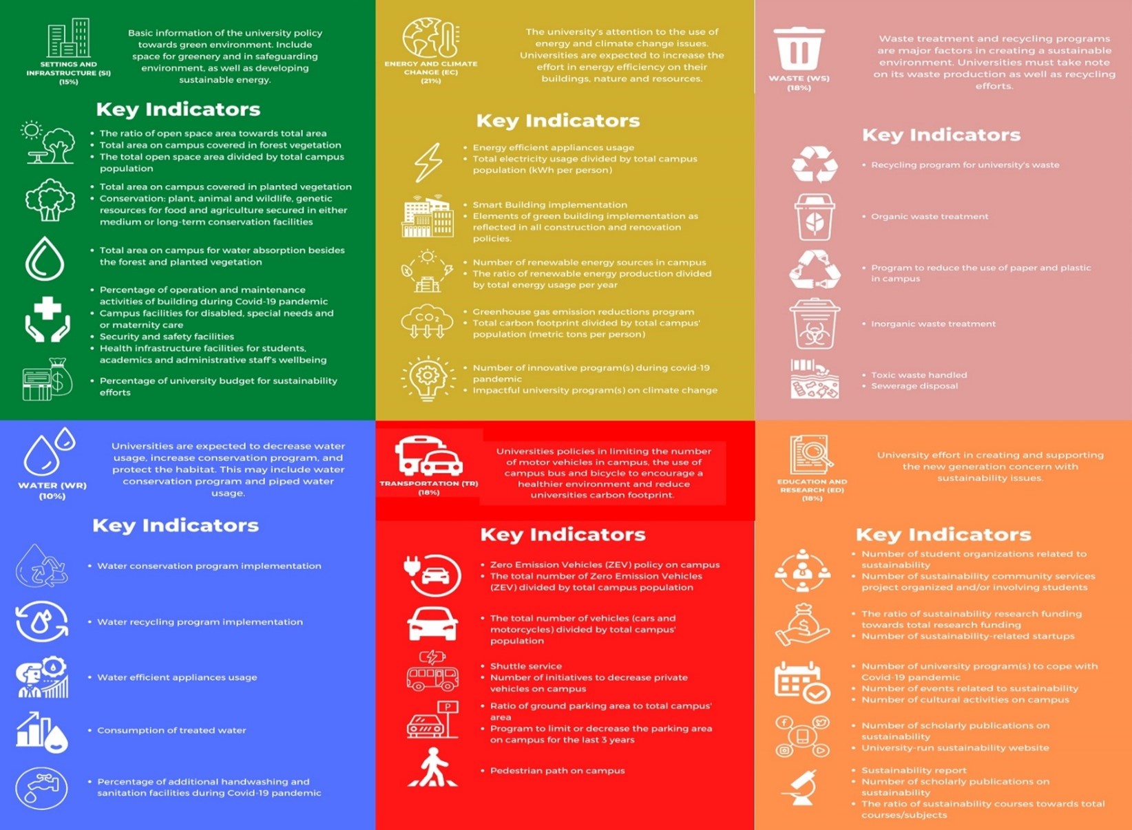 يعتبر Green Metricالعالمي هو تصنيف الحرم الجامعي الأخضر والاستدامة البيئية الذي بدأته جامعة اندونيسيا في عام 2010. من خلال 39 مؤشرًا في 6 معايير ، حيث حددت تصنيفات العالمية بحسب التزام الجامعات ومبادراتها البيئية اعتمادا على عدة معايير ، وهي :