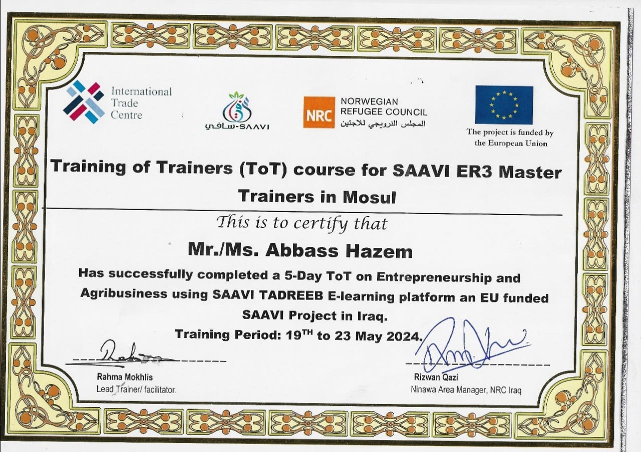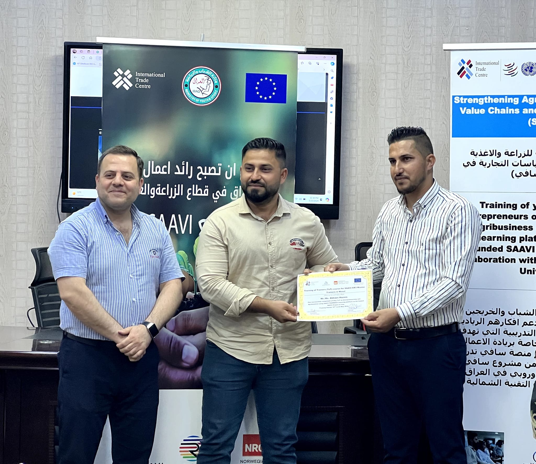 شارك م.مهندس عباس حازم احد منتسبي مركزنا في الدورة التدريبية التي اقامتها منظمة NRC في الجامعه التقنية الشمالية والتي كانت تتضمن التدريب على المنصة الالكترونية saavi tadreeb وذلك ضمن مشروع تعزيز سلسلة قيمة الزراعة والاغذية الزراعية وتحسين السياسات التجارية في العراق.
