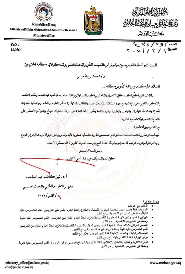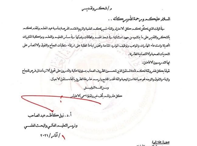 وزير التعليم يوجه شكره وتقديره للتدريسيين في الجامعات كافة ويؤكد: إنكم قادة المستقبل وقادرون على تحويل الأزمات الى فرص للنجاح