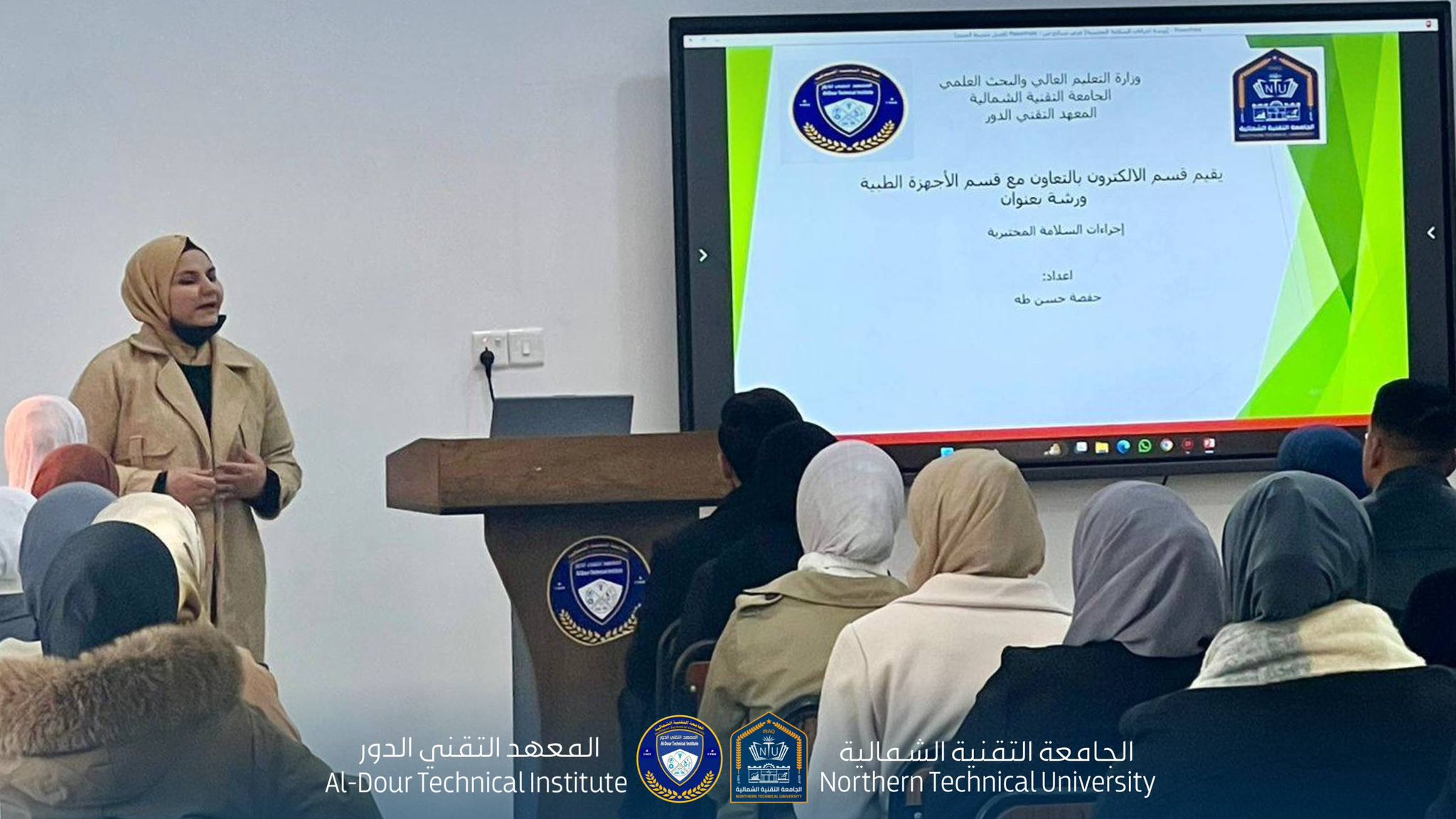 Under the supervision of the respected Dean of the Institute, and through the University Quality Assurance Division, the Department of Medical Devices Technologies organized, during the current month of January, a workshop on laboratory safety procedures. The workshop was delivered by Engineer Hafsa Hassan Taha, and the target audience included the staff and students of the aforementioned department.