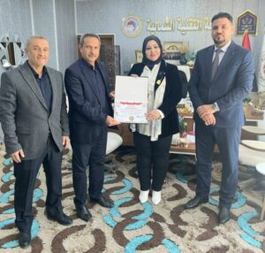 in the presence of the Assistant President of the University for Administrative Affairs, Dr. Zinoun Younis Zinoun. The shield was given in recognition of our university’s hosting of the Iraqi Universities Women’s Volleyball Championship, which was held in Kirkuk with the participation of nine government and private universities. The team from our university obtained sixth place in the tournament, and they also received a participation certificate for their involvement in the Iraqi Universities Men’s Volleyball Championship held in Najaf/ Al-Furat Al-Awsat Technical University.